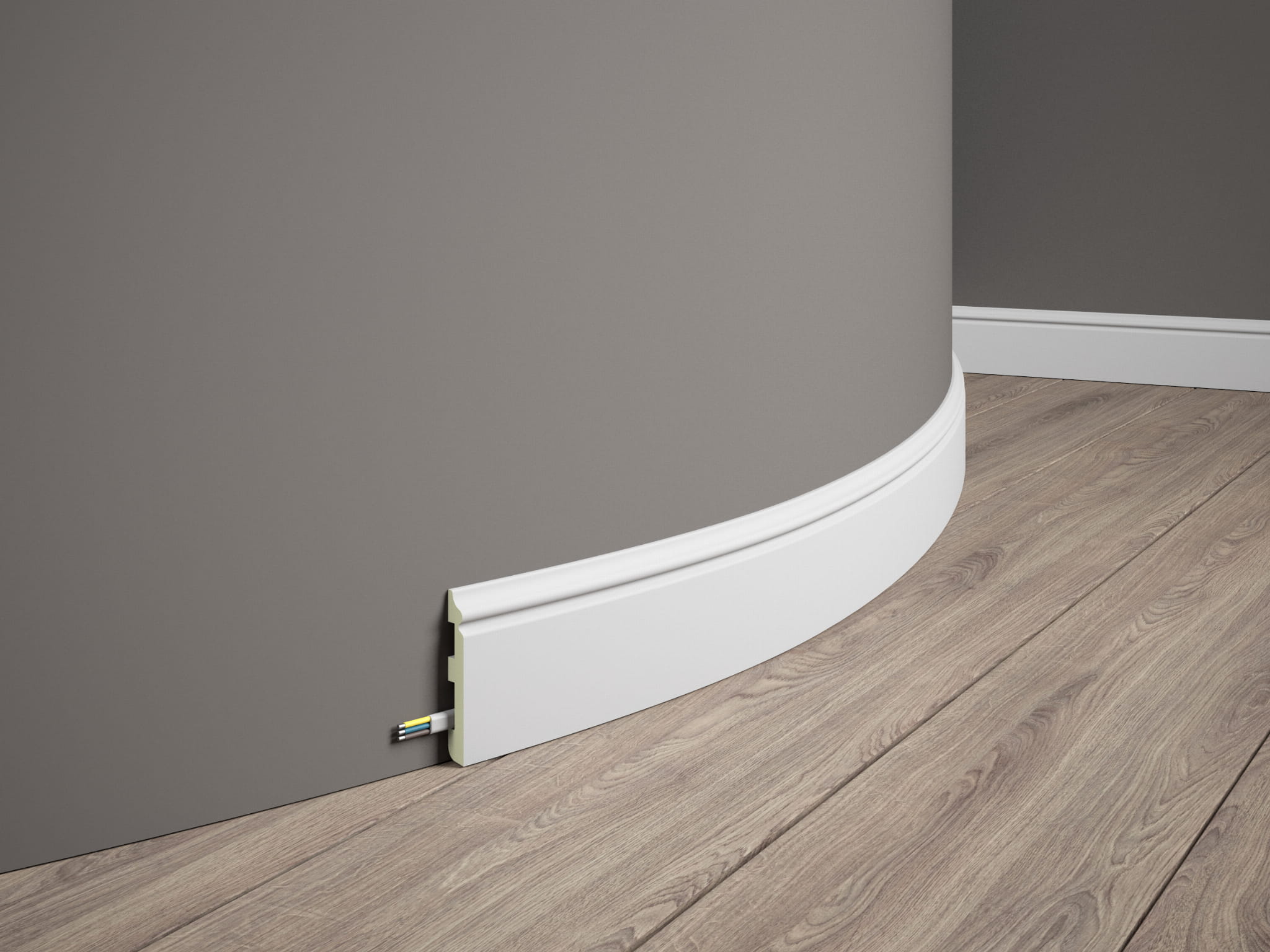 Listwa przypodłogowa MD018F Mardom Decor. Klasyczny profil estetycznie porządkuje proporcje i dodaje ponadczasowego charakteru. Maskuje dylatacje i chroni ściany przy podłodze, spajając całość z ościeżnicami. Wersja Flex wyłącznie na krzywizny: łuki, kolumny i wykusze; nie do odcinków prostych.