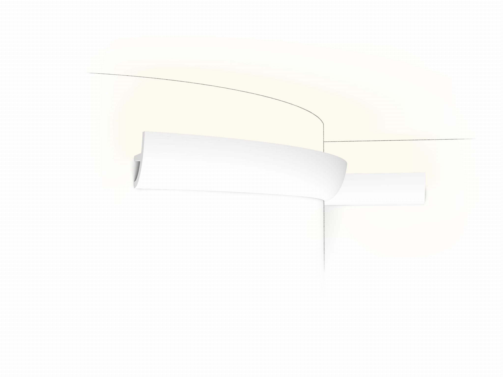 Listwa sufitowa oświetleniowa C373F Orac Decor. Minimalistyczna, skandynawska linia wprowadza ład i lekkość we wnętrzu. Porządkuje styk ściany i sufitu oraz tworzy subtelny światłocień. Wersja Flex wyłącznie na krzywizny: łuki, kolumny i wykusze; nie do odcinków prostych. Pozwala dodać dyskretne, pośrednie oświetlenie LED.