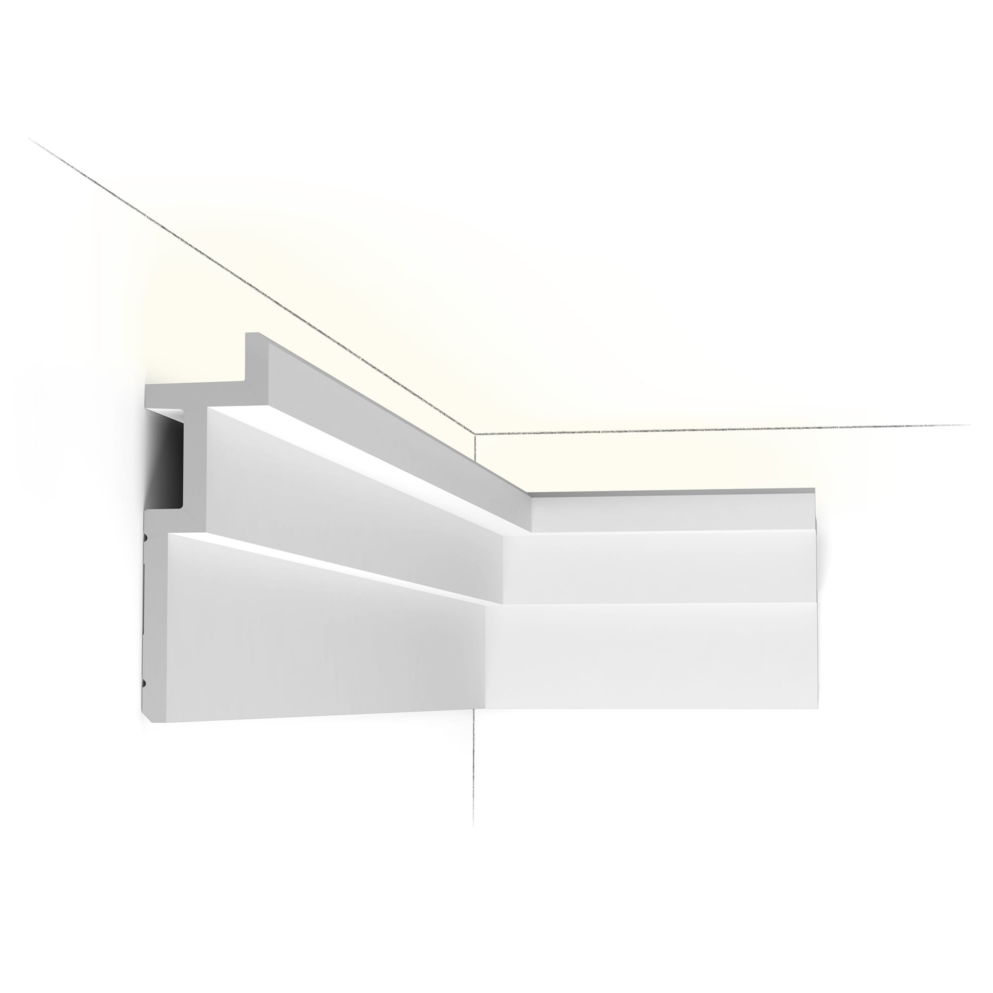Listwa sufitowa oświetleniowa C396 Orac Decor. Geometryczna, industrialna linia porządkuje przestrzeń i podkreśla minimalistyczny charakter. Porządkuje styk ściany i sufitu oraz tworzy subtelny światłocień. Wysoka gęstość wiernie odwzorowuje detal; gładka powierzchnia świetnie przyjmuje farbę. Pozwala dodać dyskretne, pośrednie oświetlenie LED.