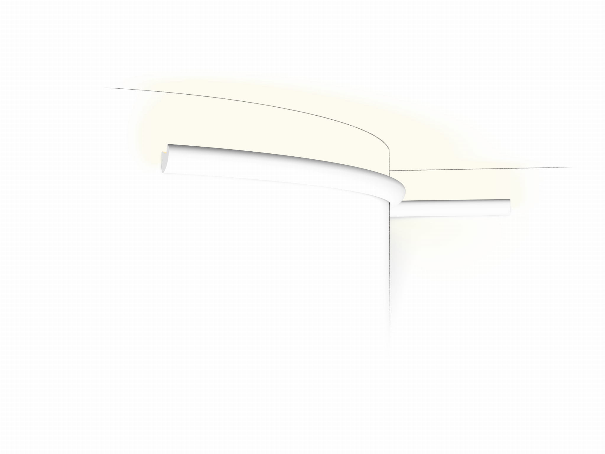 Listwa sufitowa oświetleniowa CX188F Orac Decor. Minimalistyczna, skandynawska linia wprowadza ład i lekkość we wnętrzu. Porządkuje styk ściany i sufitu oraz tworzy subtelny światłocień. Wersja Flex wyłącznie na krzywizny: łuki, kolumny i wykusze; nie do odcinków prostych. Pozwala dodać dyskretne, pośrednie oświetlenie LED.