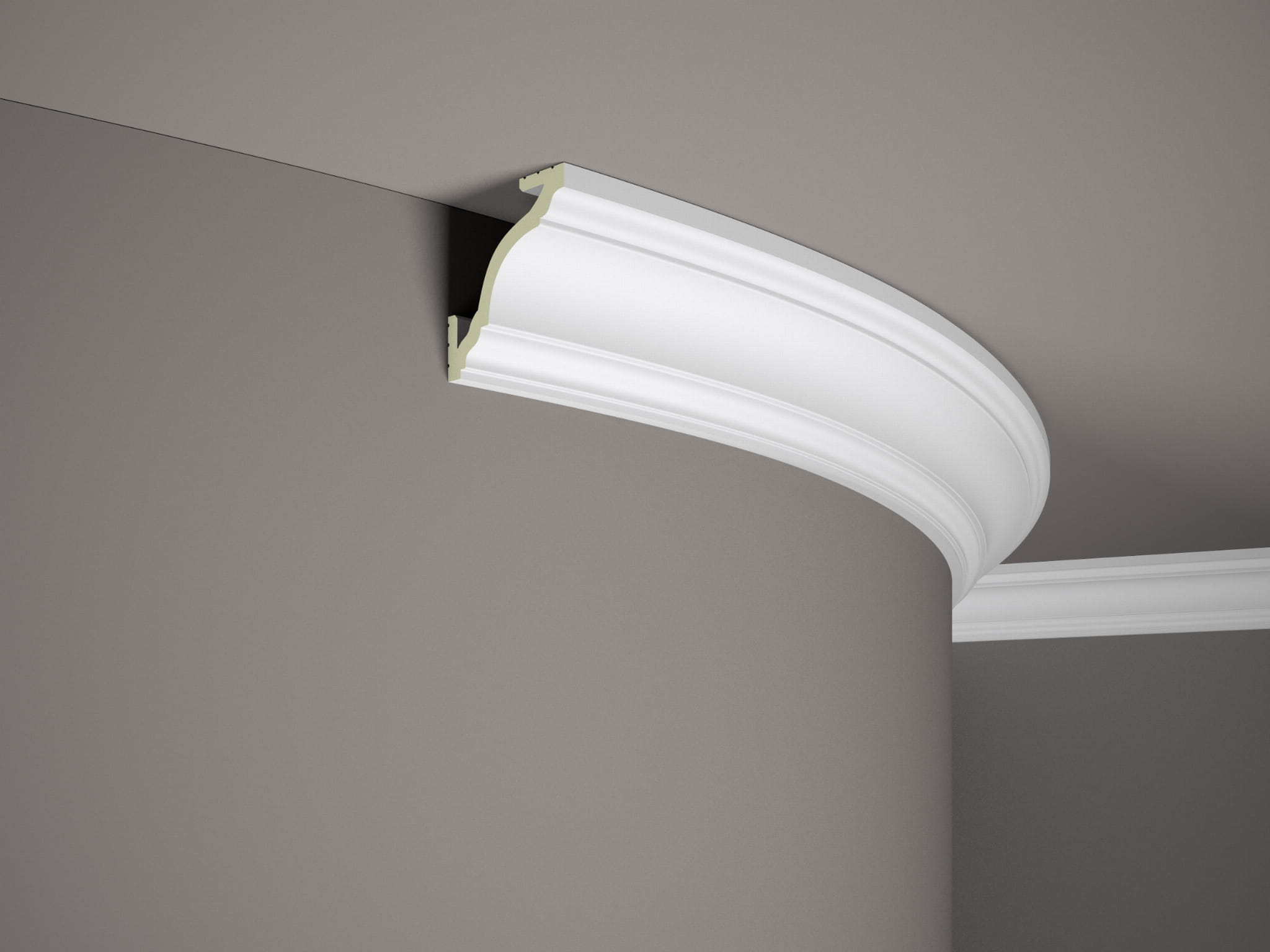 Listwa sufitowa oświetleniowo-karniszowa MD213F Mardom Decor. Klasyczny profil o bogatym wzornictwie dodaje elegancji i głębi aranżacji. Porządkuje styk ściany i sufitu oraz tworzy subtelny światłocień. Wersja Flex wyłącznie na krzywizny: łuki, kolumny i wykusze; nie do odcinków prostych. Umożliwia montaż taśmy LED i estetycznie ukrywa szynę karnisza.