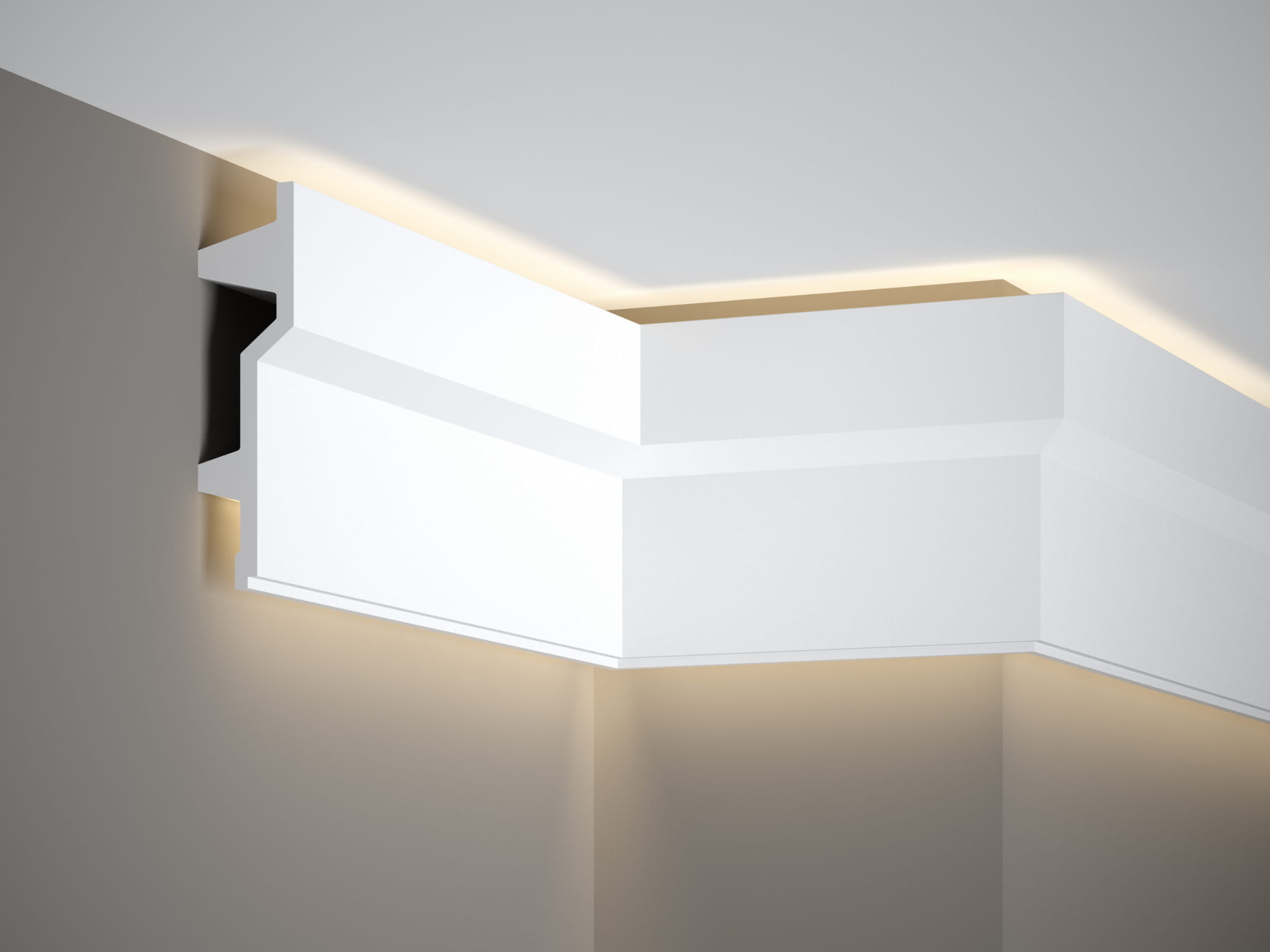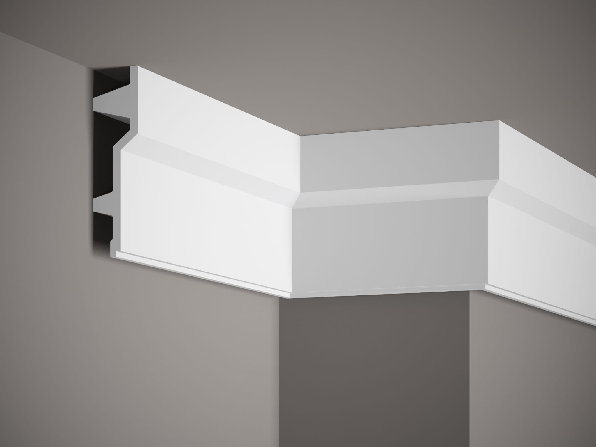 Listwa sufitowa oświetleniowa MDB150 Mardom Decor. Geometryczna, industrialna linia porządkuje przestrzeń i podkreśla minimalistyczny charakter. Porządkuje styk ściany i sufitu oraz tworzy subtelny światłocień. Lekki, odporny na wilgoć, łatwy do malowania po zagruntowaniu, wygodny w pracy nad głową. Pozwala dodać dyskretne, pośrednie oświetlenie LED.